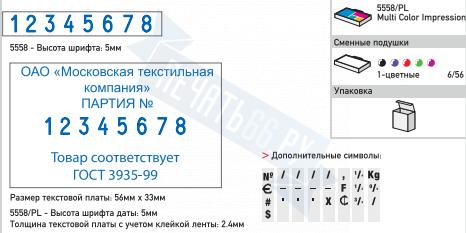 | Размер поля 56 х 33 мм. Высота шрифта: 5 мм. |