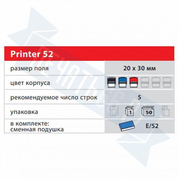 Оснастка Colop Printer 52 имеет: окно персонализации, клеевой слой для крепления клише печати. Штемпельная подушка E/52: сменная, синяя, в комплекте.