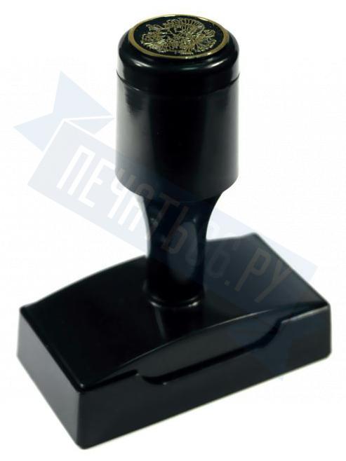Ручная пластмассовая оснастка с крышкой для печати, штампа, факсимиле имеет клеевой слой для крепления клише печати.